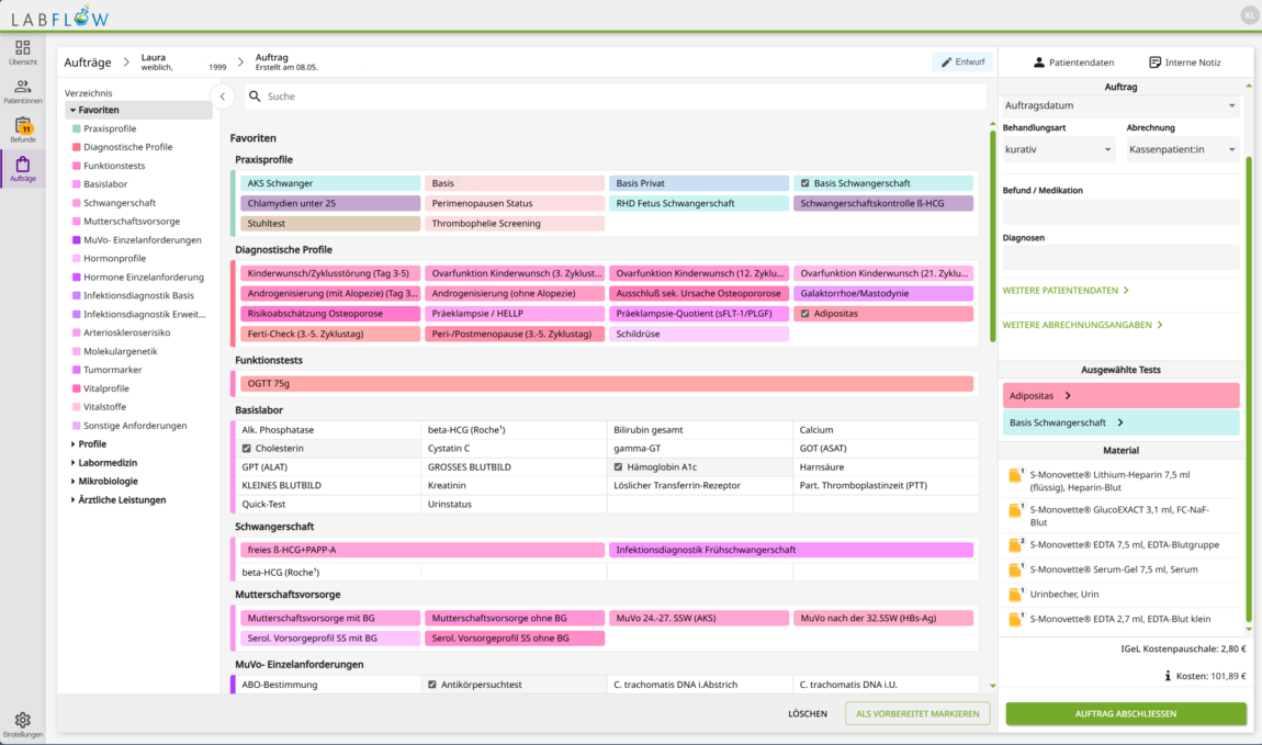 Eingebunden sind die verschiedenen Laborbereiche – das Routinelabor, die Mikrobiologie sowie unser Spezialbereich, die Genetik. Durch die Integration unserer kuratierten Datenbank im Hintergrund kann LabFlow die optimale Bestellunterstützung über Verdachtsdiagnosen zu einer genetischen Fragestellung bieten.